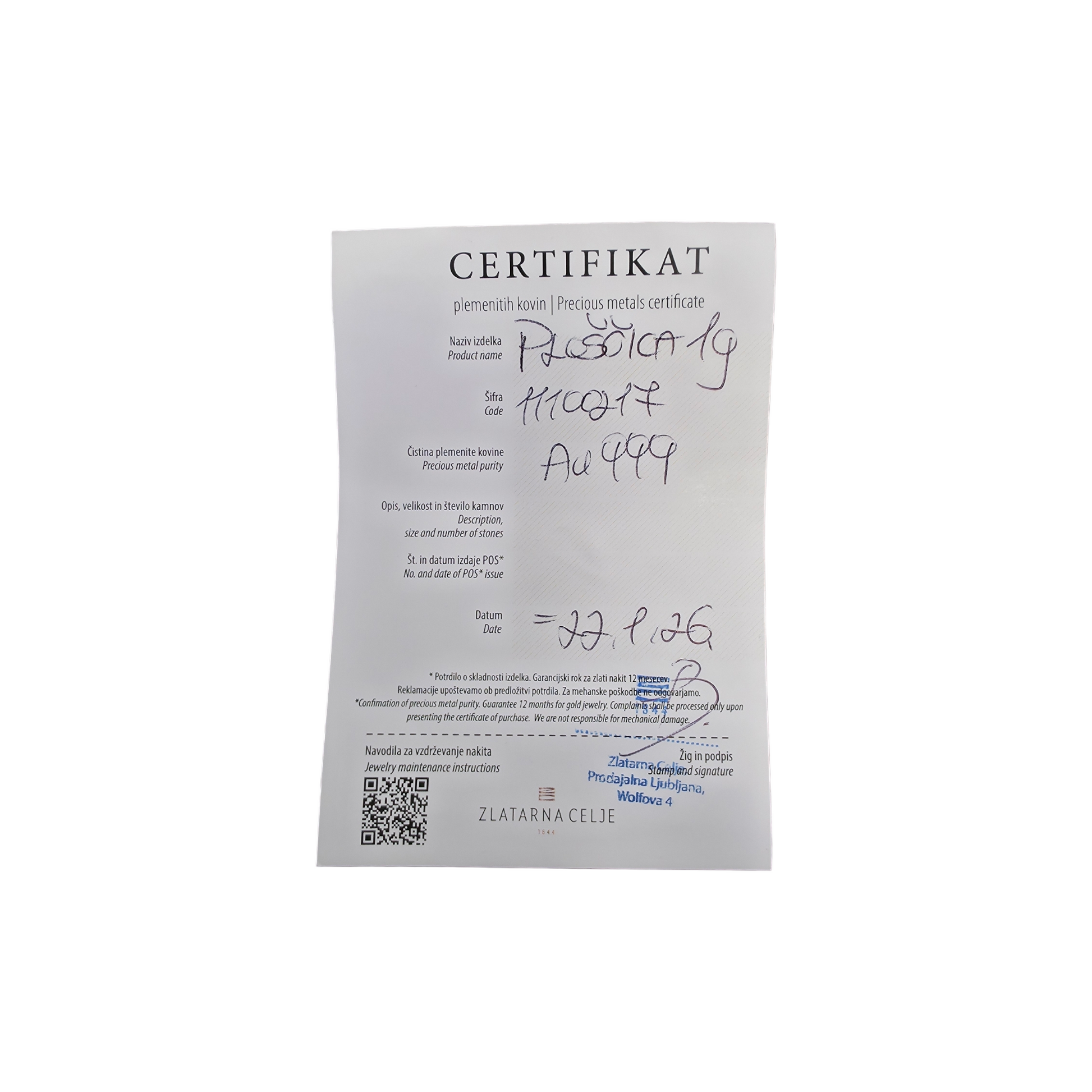 Prodajamo naložbeno zlato Zlatarna Celje gram sreče.